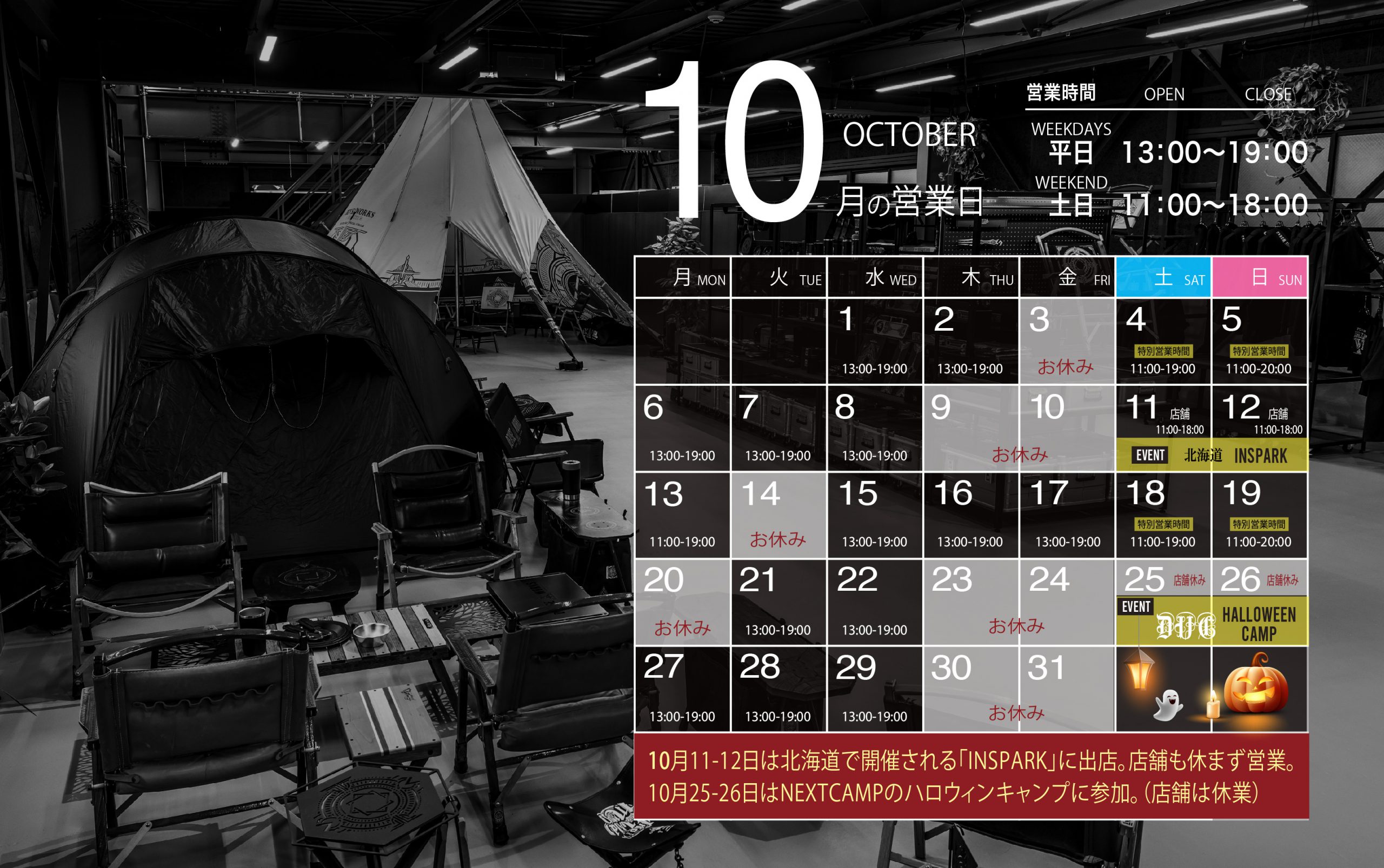 2022年10月の営業日は上記の通りとなっております。10月29〜30日に行われるイベントNEXTCAMPハロウィン...